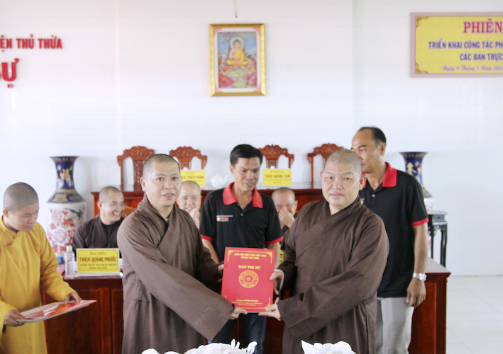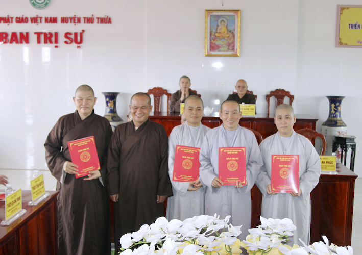 Sau cùng, Đại đức Chánh thư ký đọc quyết định chuẩn y nhân sự các ban trực thuộc BTS.GHPVN huyện Thủ Thừa NKX 2021 – 2026.