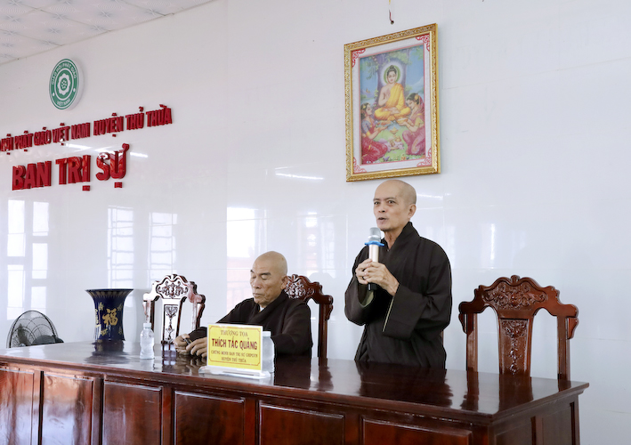 Sau cùng, Đại đức Thích Quảng Phước, đã thay mặt chư tôn đức Tăng Ni trong Ban thường trực có lời cảm ơn đến toàn thể Chư tôn Thượng tọa chứng minh, Chư tôn đức Tăng Ni trong Ban Thường trực BTS GHPGVN huyện Thủ Thừa. Chư tôn đức Tăng Ni trụ trì các tự viện trong huyện nhà lời chúc sức khỏe – Vô lượng an lạc – Vô lượng kiết tường.
