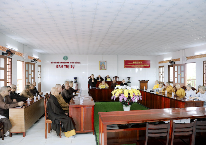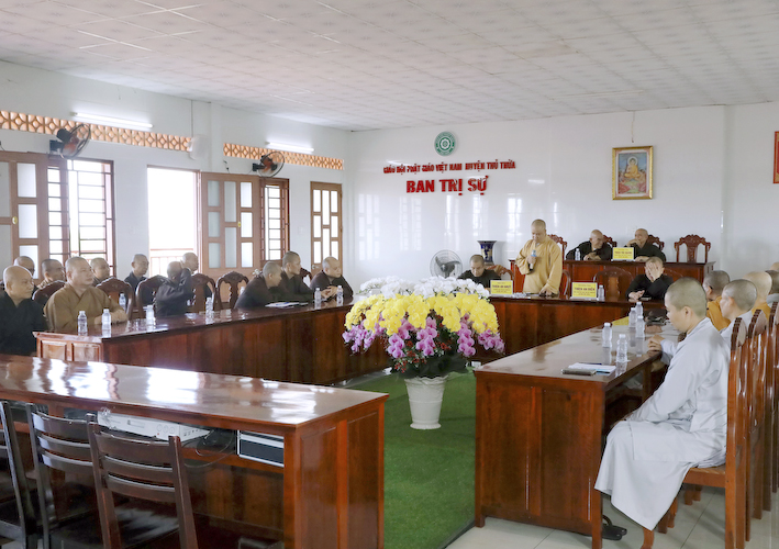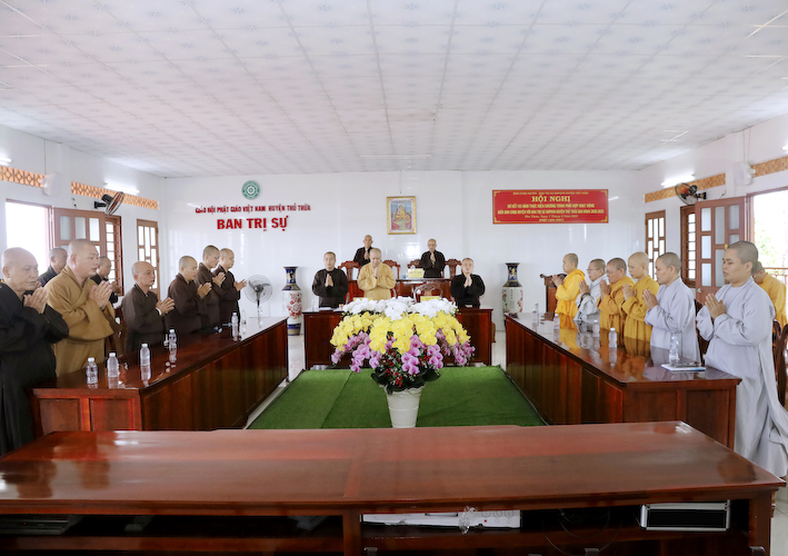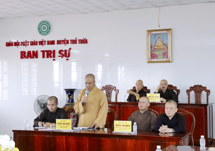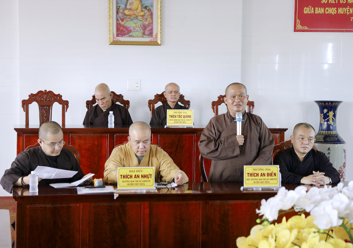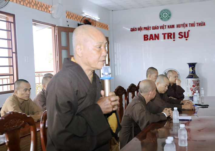 Chứng minh phiên họp, Hòa thượng Thích Tắc Quảng – Chứng minh BTS GHPGVN huyện Thủ Thừa phát biểu: “Sau khi nghe qua báo cáo của các tự viện, chúng tôi hoan hỷ thống nhất, ghi nhận nổ lực của các Tự viện trong công tác Phật sự tại huyện nhà. Xin tán thán công đức của chư Tăng Ni trụ trì đã quan tâm và hỗ trợ cho công tác từ thiện xã hội huyện nhà được con số thật ấn tượng. Cầu Tam bảo gia hộ cho chư tôn đức dồi dào sức khỏe và các tự viện ngày càng được phát triển”.