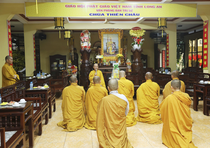 Sáng ngày 19 tháng Chạp năm Quý Mão, Tại văn phòng BTS GHPGVN huyện Thủ Thừa, Tổ đình Kim Cang, ấp Bình Cang 1, xã Bình Thạnh, Chư tôn đức Tăng Ni trong Ban Thường trực BTS đã tổ chức phái đoàn đi thăm và chúc tết các tự viện tiêu biểu trong tỉnh nhà như: Chùa Thiên Châu – Văn phòng BTS GHPGVN tỉnh Long An, Chùa Thiên Khánh và các tự viện tiêu biểu của huyện Thủ Thừa như: Chùa Long Thạnh, chùa Kim Cang, chùa Kim Thọ và chùa Vĩnh Phong.