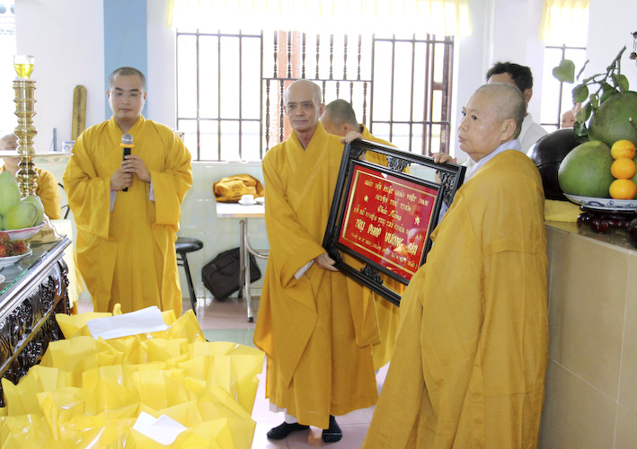 Thượng tọa Thích Quảng Tâm – UVHĐTS, Phó Trưởng ban BTS. GHPGVN Tỉnh Long An đại lao chư tôn thiền đức trong Ban Thường trực BTS.GHPGVN tỉnh Long An trao quyết định bổ nhiệm trụ trì.