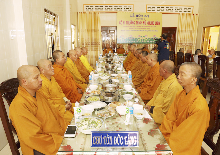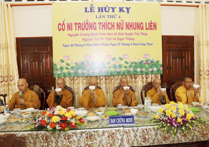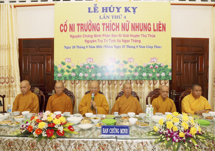 Về chứng minh buổi lễ huý kỵ, Hoà thượng đạo hiệu Thích Minh Thiện – Uỷ viên HĐTS, Phó ban Hoằng pháp Trung ương, Trưởng BTS GHPGVN tỉnh Long An ban đạo từ tại buổi lễ: “Hôm nay nhân ngày huý nhật lần thứ 4 Cố Ni Trưởng Nhung Liên, chư Ni và Phật tử tại đạo tràng thể hiện tinh thần hiếu tâm, hiếu đạo của mình đã như pháp cung thỉnh chư tôn Hoà thượng, chư Thượng tọa, chư Đại đức tăng ni quang lâm về nơi đạo tràng khai kinh và thiết trai cúng dường. Xin hồi hướng công đức cho Phật pháp được xương minh, tăng già được hoà hợp tứ chúng đồng tu. Nhất là thể hiện tinh thần hiếu tâm, hiếu hạnh để nối tiếp tâm nguyện của Cố Ni trưởng đã dày công xây dựng đạo tràng và giáo dưỡng chư ni, chúng đệ tử của Ni trưởng.
