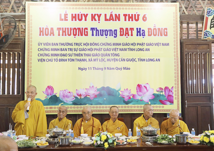 Đại lao chư tôn Hoà thượng chứng minh, Hoà thượng đạo hiệu Thích Minh Thiện – UV HĐTS, Phó ban Hoằng pháp TW, Trưởng BTS GHPGVN tỉnh Long An ban đạo từ: “Hôm nay ngày huý nhật Đức Trưởng lão Hòa thượng Uỷ viên Ban TT HĐCM TWGHPGVN, Chứng minh BTS GHPGVN tỉnh Long An, Viện chủ Tổ Đình Tôn Thạnh. Vì cảm niệm ân đức cao dày của Hòa thượng Ân Sư nên quý vị đã thiết lễ trai nghi, để kỷ niệm ngày huý nhật của Ngài,như pháp cầu thỉnh Chư tôn đức Tăng Ni, các bậc Trưởng thượng trong giáo hội, trong sơn môn, cũng như những vị đã đồng hạnh, đồng nguyện với Hòa thượng. Vì thương tưởng hiếu tâm, hiếu hạnh của toàn thể môn nhơn tứ chúng, nên chư tôn đức đã thân lâm về Tổ đình để chứng minh lễ này.