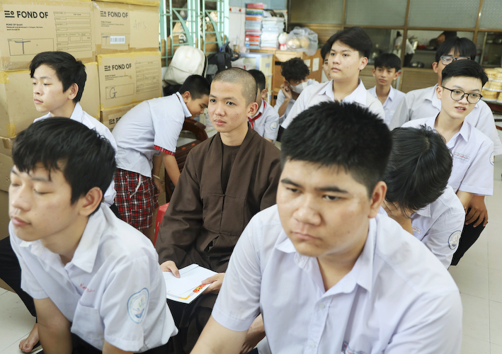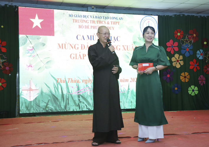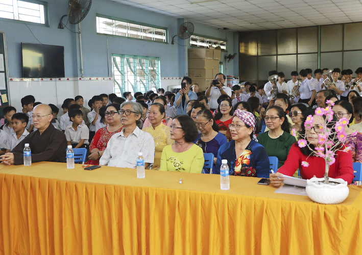 Phát biểu chỉ đạo tại buổi lễ Sơ Kết Học kỳ I, niên học 2023 – 2024, Thượng Thích Quảng Tâm xin thành kính tri ân sự giúp đỡ tận tình của các Mạnh Thường Quân, quý ân nhân ở khắp nơi đã giúp đỡ nhà trường trong suốt thời gian qua. Thượng tọa cũng cảm ơn các công ty đã tài trợ cho các em có một cái tết nồng ấm, nhân dịp tết Giáp Thìn. Qua báo cáo, vẫn còn một số em học sinh chưa đạt được kết quả như mong muốn thì đó là sự băn khăn, lo lắng của toàn thể quý Thầy Cô và BGH nhà trường. Khu nội trú có ít người quản lý. Rất mong các em biết tự quản lý để không bận lòng quý Thầy Cô giáo. BGH nhà trường và quý Thầy Cô luôn lo lắng về sự học tập và mong rằng các em khi rời khỏi ghế nhà trường bước vào đời có một tương lai tươi sáng hơn. Nhà trường vẫn tiếp tục chăm lo cho các em ở học kỳ II. Mong các em cố gắng để không phụ lòng các Mạnh Thường Quân, quý ân nhân ở khắp nơi đã giúp đỡ nhà trường và các em trong suốt thời gian qua”.