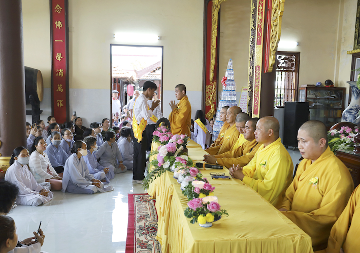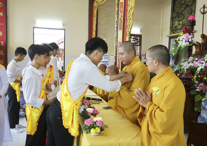 Đại diện cho Phật tử tại đạo tràng, cùng hòa theo bài hát Bông hồng cài áo, các em trong đội cài hoa tại đạo tràng chùa Khánh Minh tiến lên cài hoa hồng lên chư tôn đức. Thay cho lời chúc mừng Khánh tuế đến chư tôn đức thêm một mùa Hạ lạp, sau 3 tháng an cư tu học.