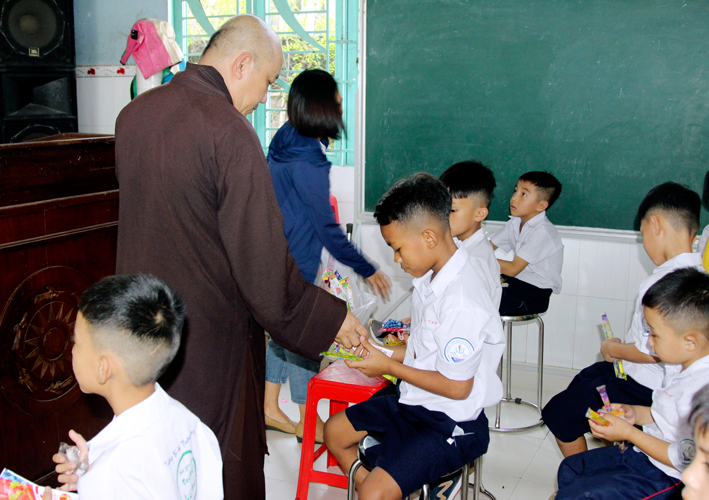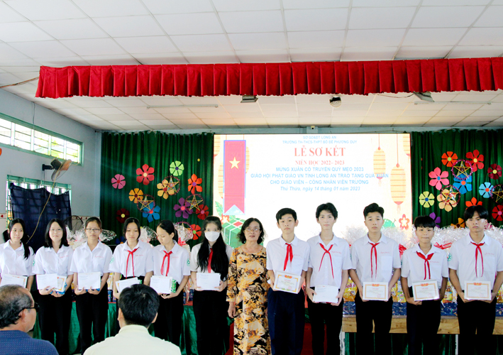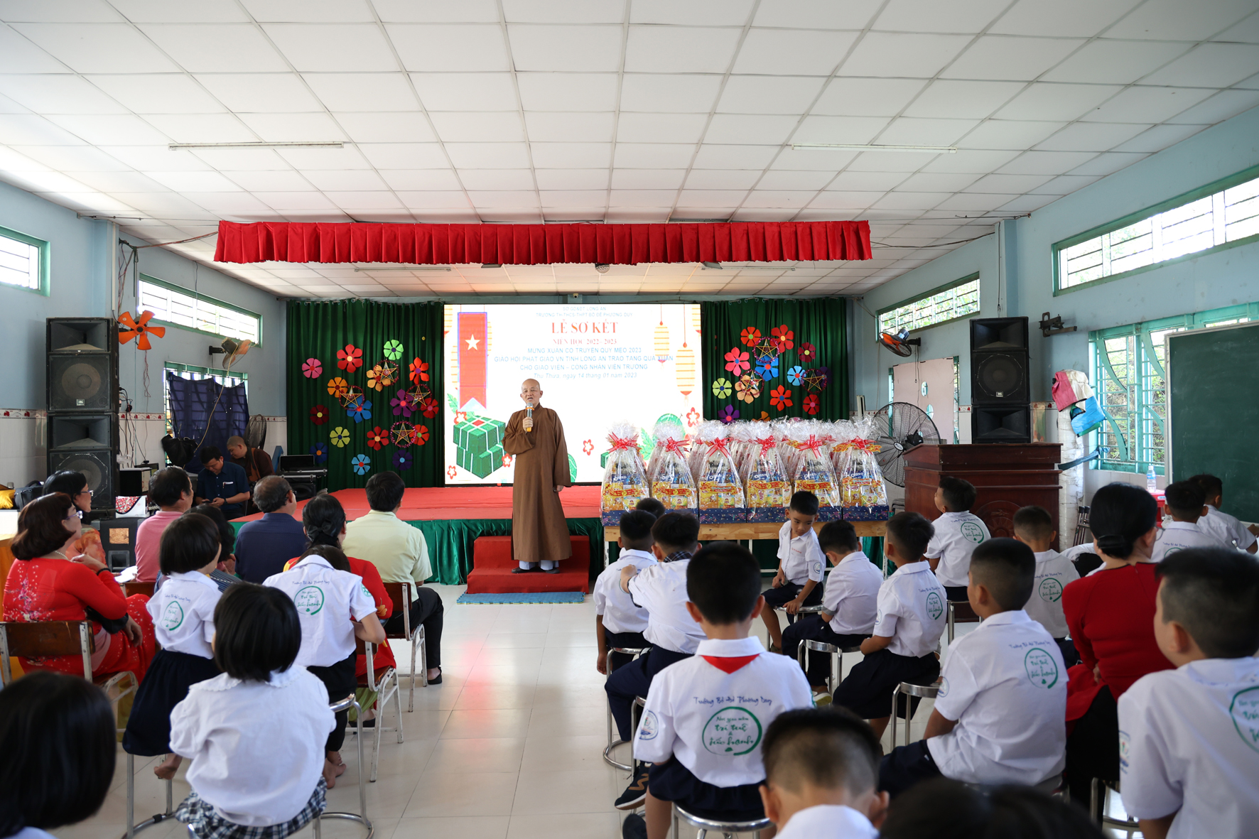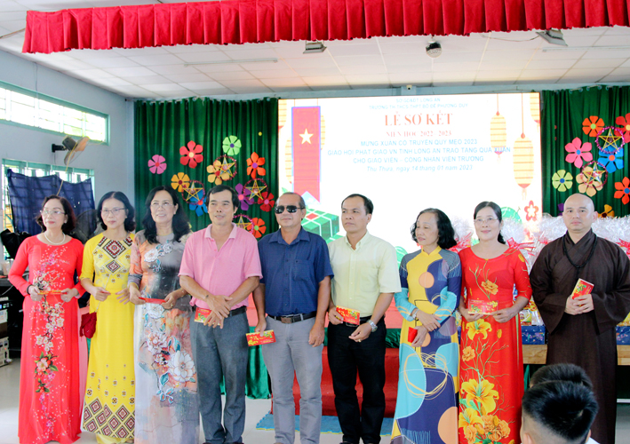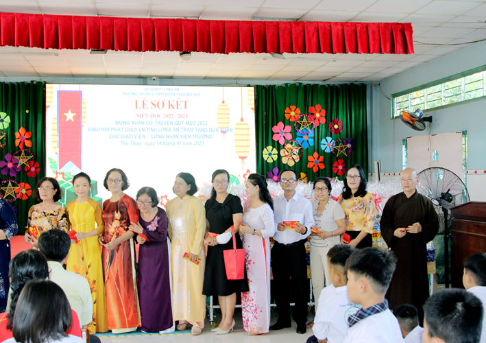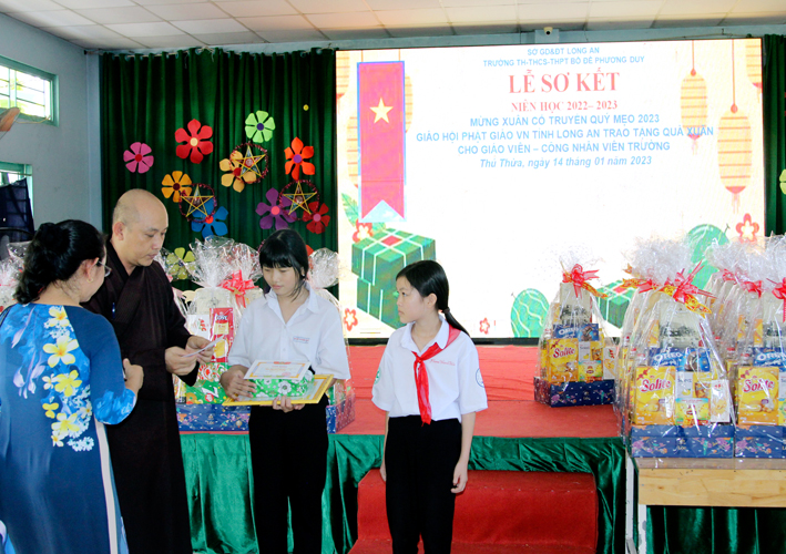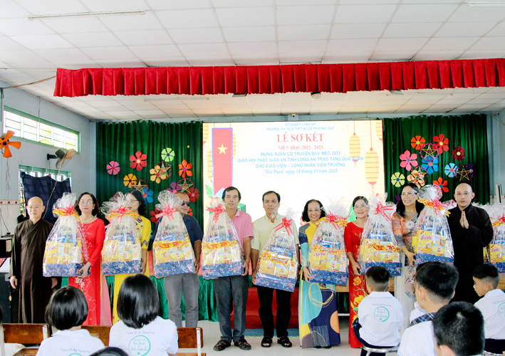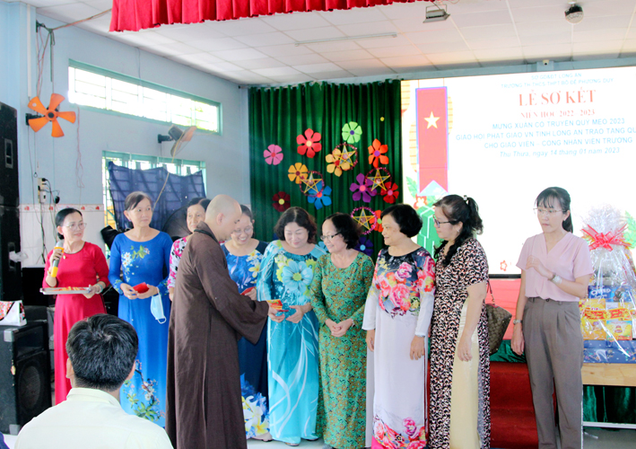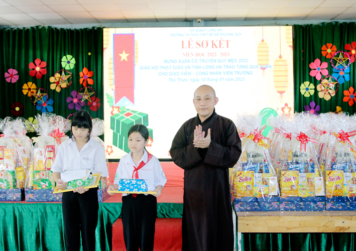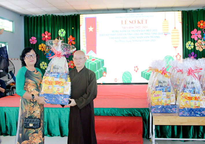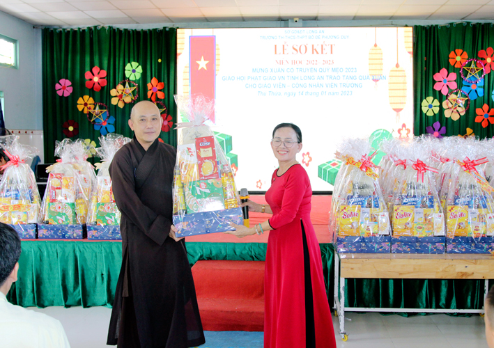 Nhân dịp này Hòa thượng Thích Minh Thiện đã vận động đại đức Thích Đức Nhân, chùa Linh Phước, huyện Châu Thành 62 phần quà gồm nhu yếu phẩm như bánh mức cho ngày tết. Mỗi phần quà trị giá 450.000đ. Tổng trị giá quà là 27.900.000đ. Hòa thượng Thích Minh Thiện ủng hộ quý thầy cô giáo nhân dịp tết đến xuân về mỗi vị một bao thư tiền mặt 500.000đ x 62 = 31.000.000đ. Như vậy mỗi phần quà trị giá 950.000đ. Tổng trị giá phần quà trao tặng quý thầy cô nhân ngày sơ kết học kỳ I – năm học 2022 -2023 là 58.900.000đ (năm mươi tám triệu, chín trăm ngàn đồng).