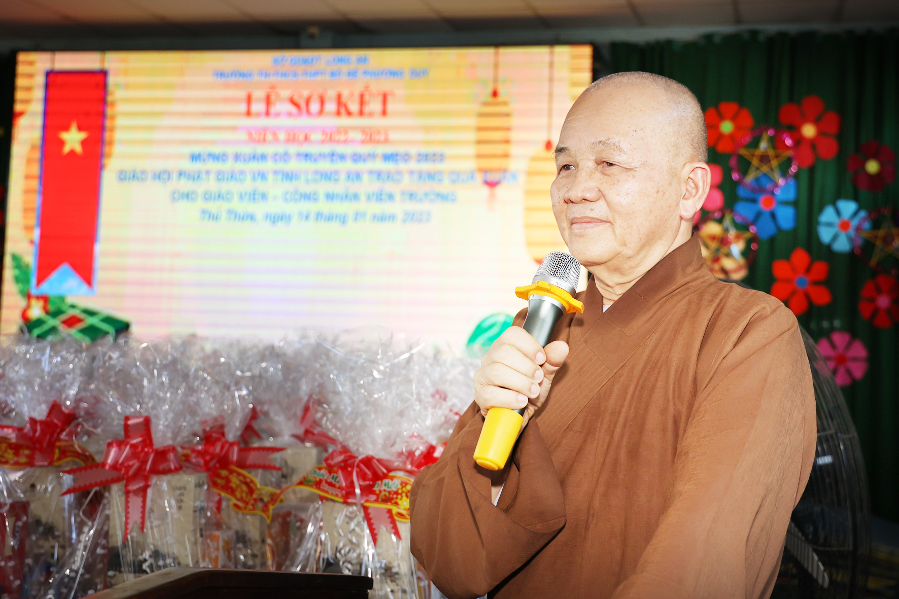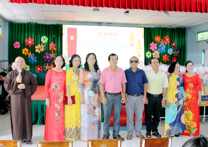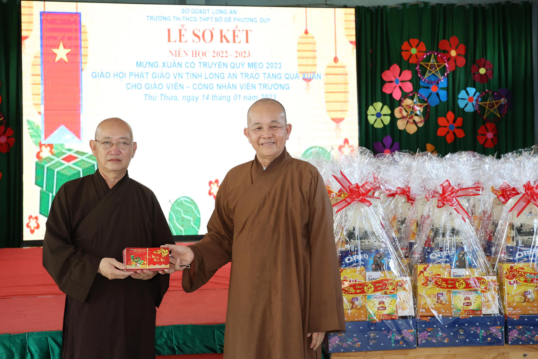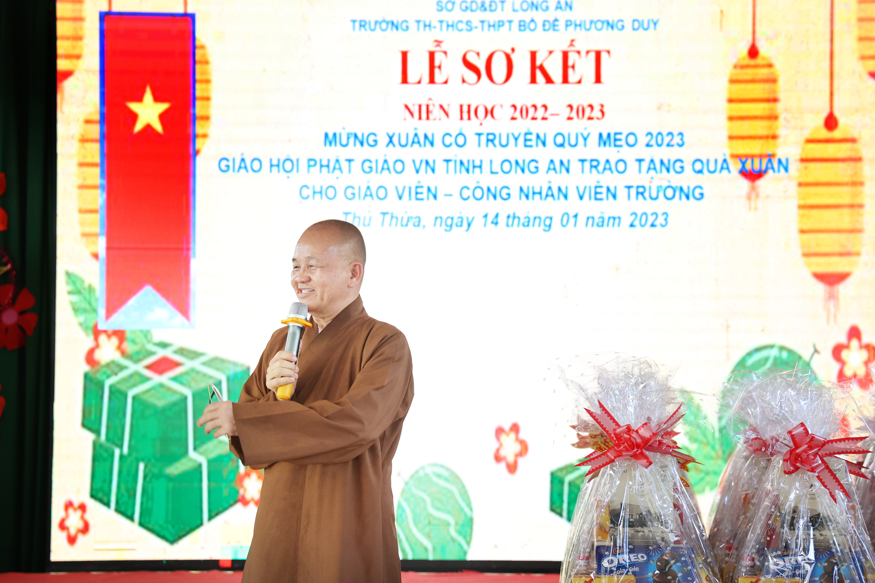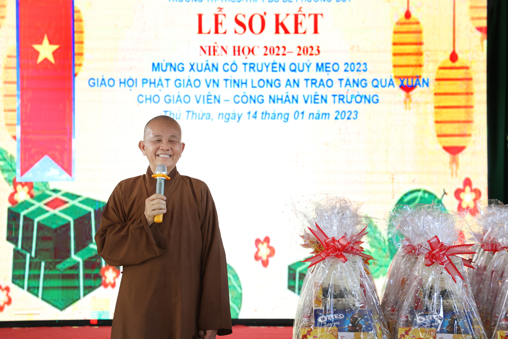 Nhân dịp này Hòa thượng Thích Minh Thiện đã vận động đại đức Thích Đức Nhân, chùa Linh Phước, huyện Châu Thành 62 phần quà gồm nhu yếu phẩm như bánh mức cho ngày tết. Mỗi phần quà trị giá 450.000đ. Tổng trị giá quà là 27.900.000đ. Hòa thượng Thích Minh Thiện ủng hộ quý thầy cô giáo nhân dịp tết đến xuân về mỗi vị một bao thư tiền mặt 500.000đ x 62 = 31.000.000đ. Như vậy mỗi phần quà trị giá 950.000đ. Tổng trị giá phần quà trao tặng quý thầy cô nhân ngày sơ kết học kỳ I – năm học 2022 -2023 là 58.900.000đ (năm mươi tám triệu, chín trăm ngàn đồng).