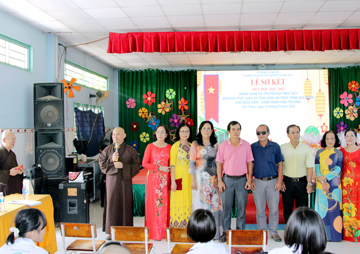 Về chứng minh và tham dự có sự hiện diện của Hòa thượng Thích Minh Thiện – Ủy viên HĐTSTW.GHPGVN, Phó Ban Hoằng pháp Trung ương, Trưởng Ban Trị sự GHPGVN tỉnh Long An, Chủ Tịch danh dự Hội đồng trường Bồ Đề Phương Duy. Thượng tọa Thích Quảng Tâm – Ủy viên HĐTSTW.GHPGVN, Phó Trưởng Ban thường trực Ban Trị sự GHPGVN tỉnh Long An, Phó Chủ Tịch Hội đồng Trường Bồ Đề Phương Duy. Đại đức Thích Lệ Ngôn – Uỷ viên thường trực BTS.GHPGVN tỉnh Long An, Trưởng Ban Hoằng pháp BTS.GHPGVN tỉnh Long An. Đại đức Thích Minh Trí – Uỷ viên BTS.GHPGVN tỉnh Long An, Chánh Thư Ký BTS.GHPGVN huyện Vĩnh Hưng. Thượng toạ Thích Minh Trí – Trưởng Ban TT –TT BTS.GHPGVN huyện Thủ Thừa cùng các thành viên trong Ban TT – TT BTS.GHPGVN huyện Thủ Thừa về đưa tin.