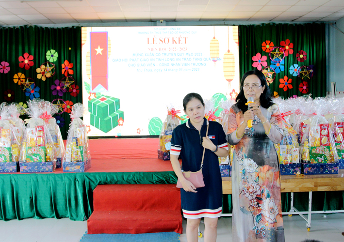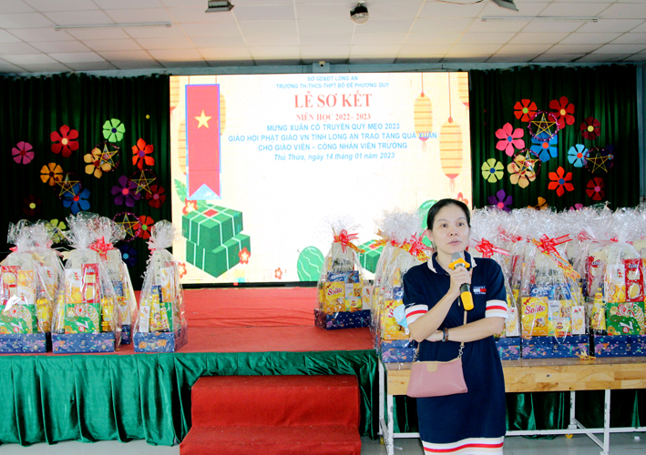 Cô Huỳnh Thị Thu Loan, Hiệu trưởng Trường Bồ Đề Phương Duy thay mặt BGH nhà trường báo cáo: Kết quả HK I – năm học 2022 -2023 với những thành tích nhất định. Trường có 12 lớp, từ lớp 1 đến lớp 12. Với tổng số 168 em học sinh(do một số em có hoàn cảnh đặc thù bỏ học). Tổng số thầy cô là 60 giáo viên. Đủ Trình độ sư phạm 100%.